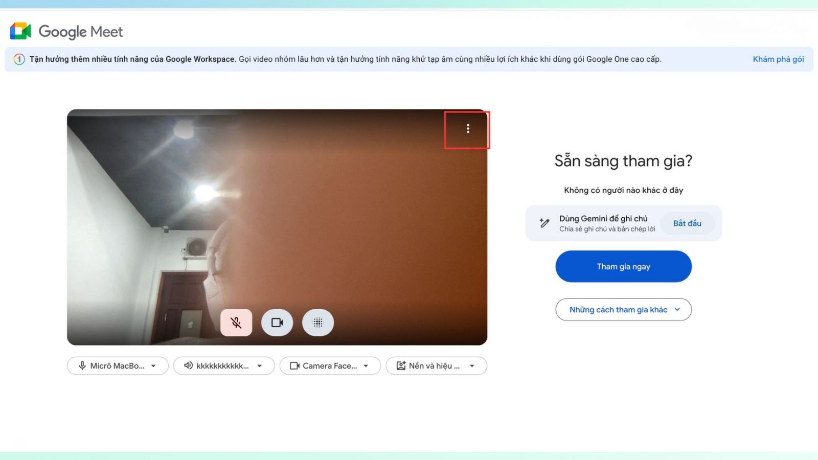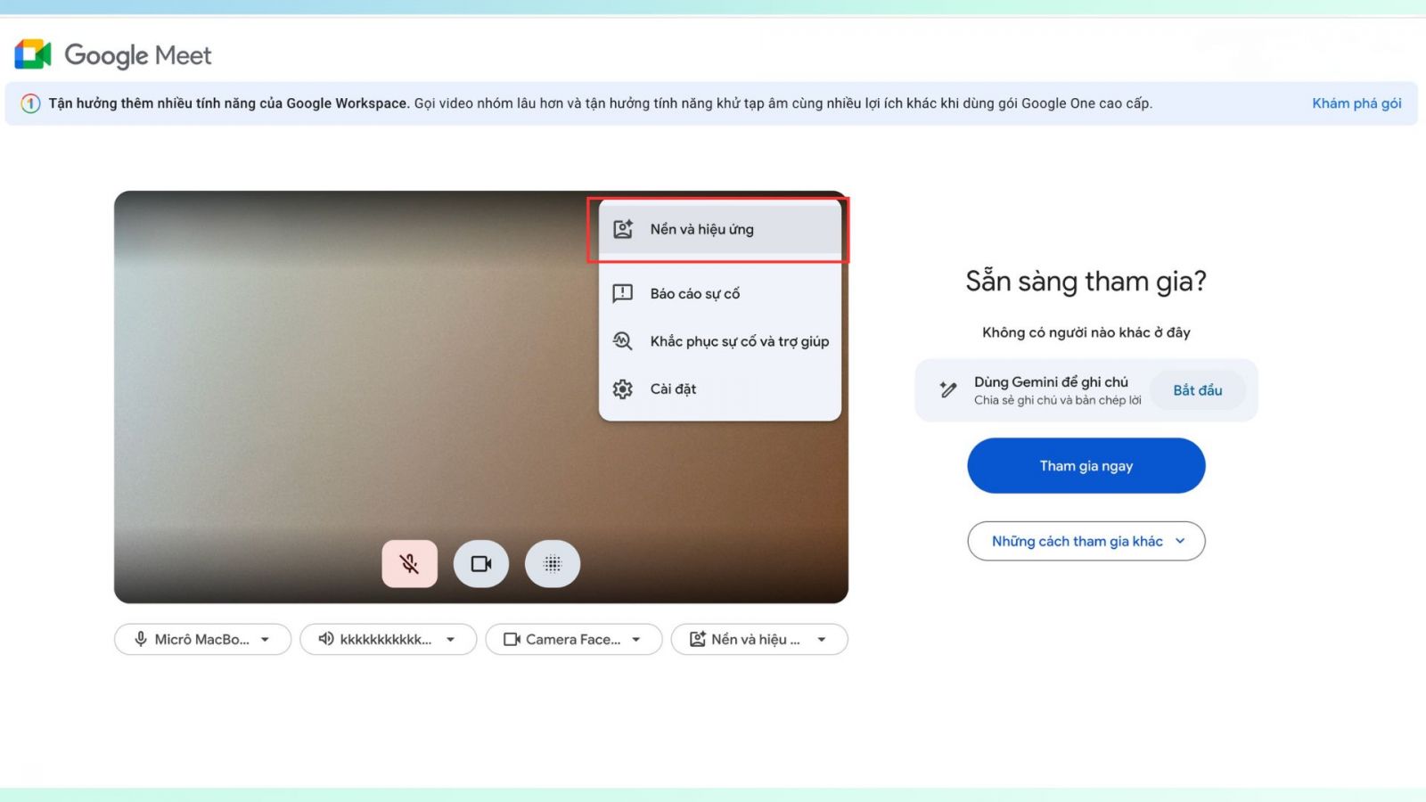 Bước 1: Mở Google Meet trên trình duyệt máy tính rồi truy cập vào liên kết cuộc họp. Tương tự điện thoại, bạn có thể thiết lập hiệu ứng trước khi vào phòng họp.