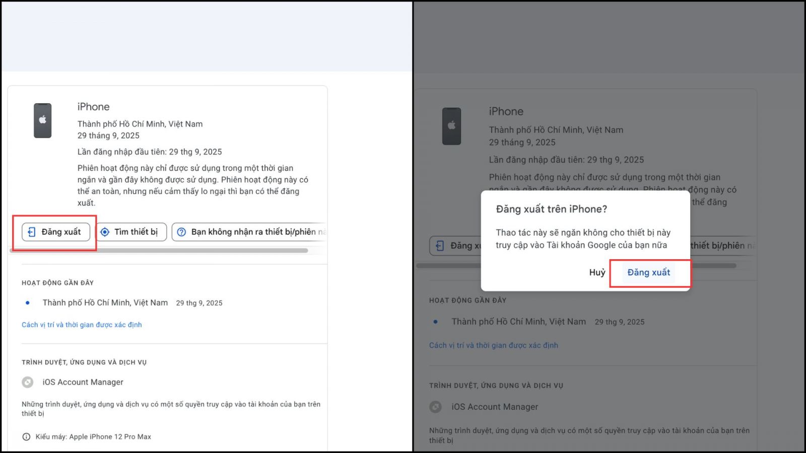 Bước 5: Nhấn Đăng xuất. Sau khi thực hiện, Google sẽ gửi thông báo xác nhận. Bạn chỉ cần chọn Đăng xuất lần nữa để hoàn tất. Khi đó, thiết bị đã chọn sẽ không còn quyền truy cập vào tài khoản của bạn.