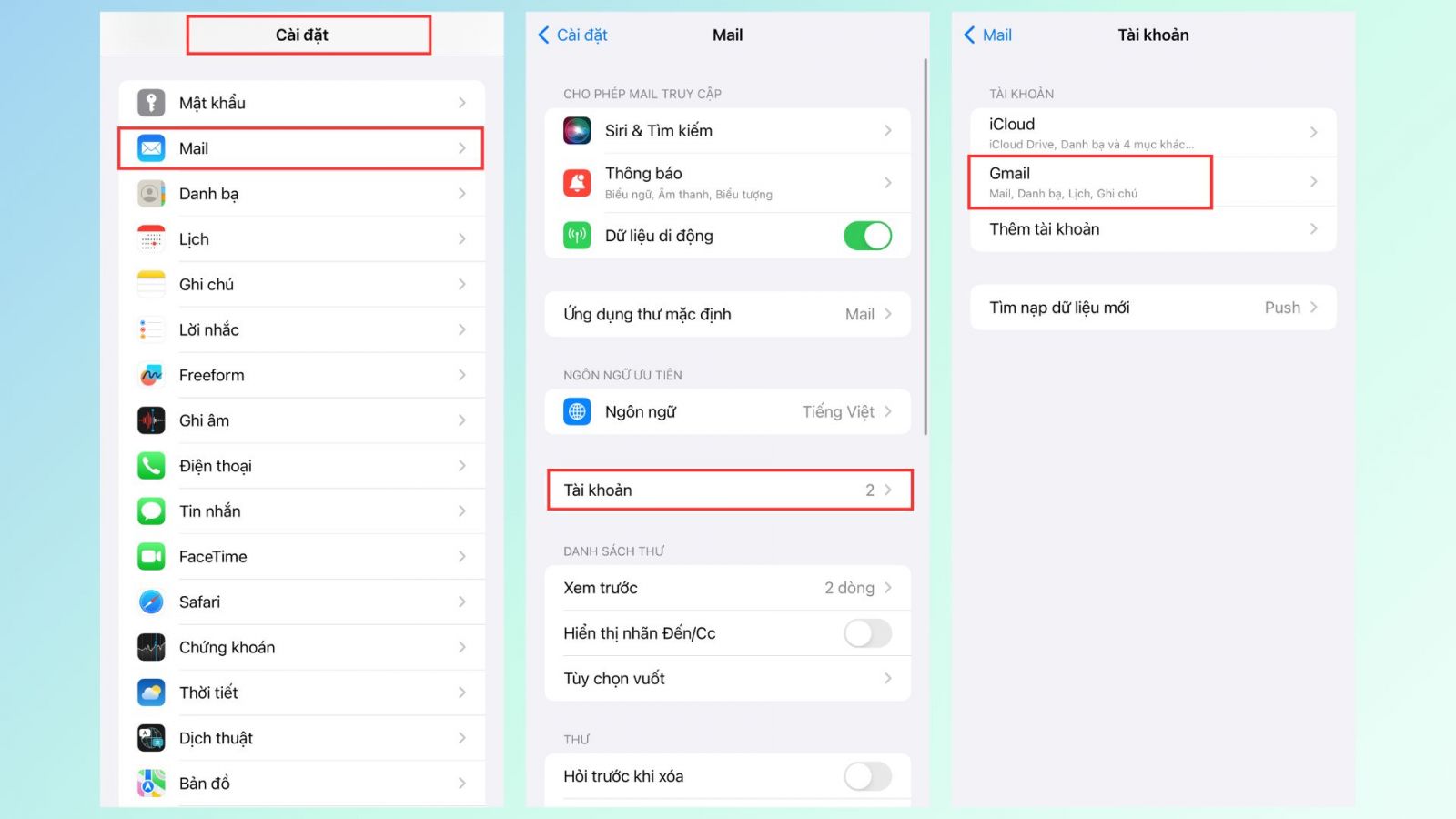 Bước 2: Nhấn vào Tài khoản, tiếp tục chọn Gmail.
