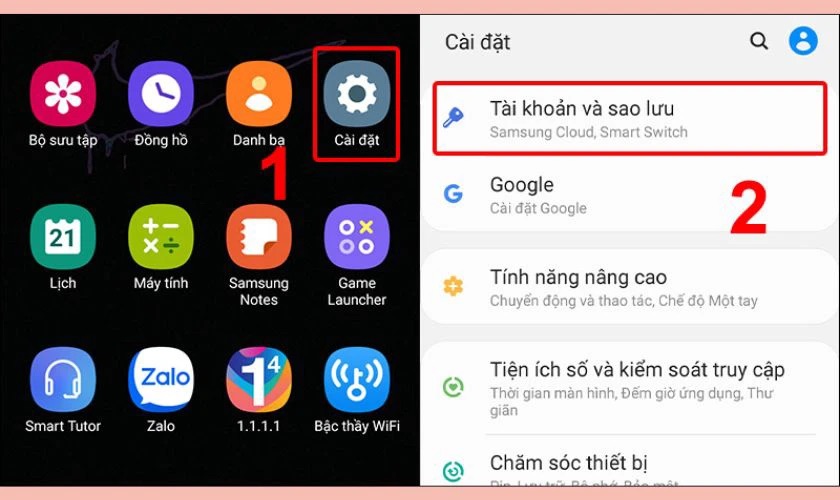 Bước 1: Truy cập vào ứng dụng Cài đặt trên điện thoại, sau đó chọn mục Tài khoản và sao lưu.