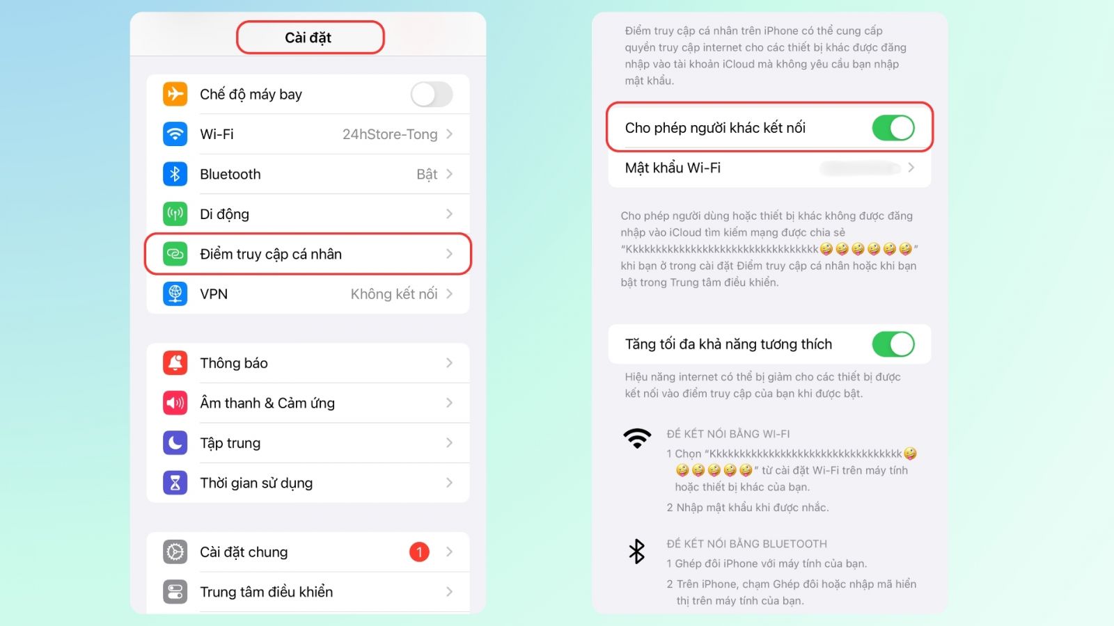Lưu ý: Để sử dụng điểm truy cập cá nhân, gói cước di động của bạn phải được nhà mạng hỗ trợ tính năng này. Bạn có thể cần vào Cài đặt > Điểm truy cập cá nhân > bật mục Cho phép người khác kết nối trước khi chia sẻ mạng.