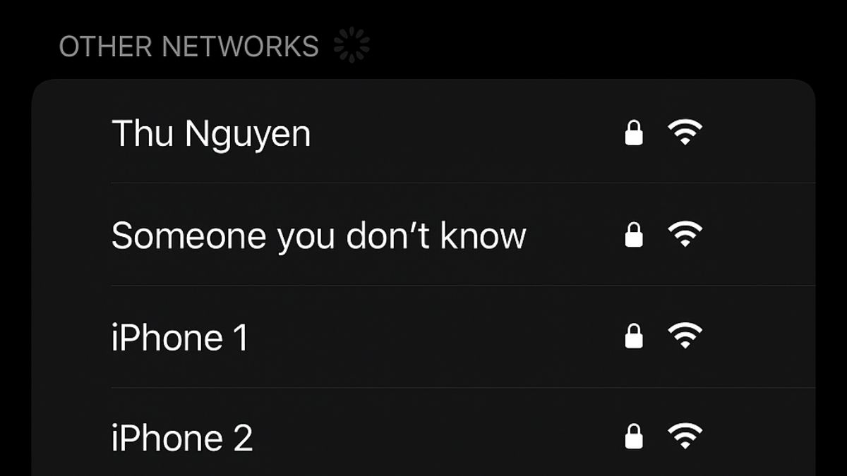 Ở khu vực đông người, danh sách Wi-Fi có thể xuất hiện hàng chục điểm truy cập với tên gần giống nhau như “iPhone”, “Galaxy” hoặc “AndroidAP”. Điều này gây khó khăn khi cần kết nối nhanh và làm tăng nguy cơ chọn nhầm mạng.