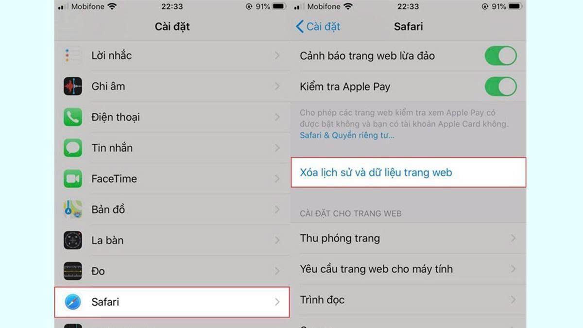 Để xóa lịch sử duyệt web, bạn có thể vào Cài đặt > Safari > Xóa lịch sử và dữ liệu trang web để làm sạch cache.