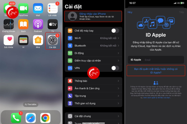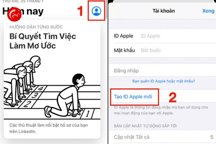 - Tạo tài khoản: Nhấn vào dòng Bạn không có ID Apple hoặc đã quên? > Chọn Tạo ID Apple.