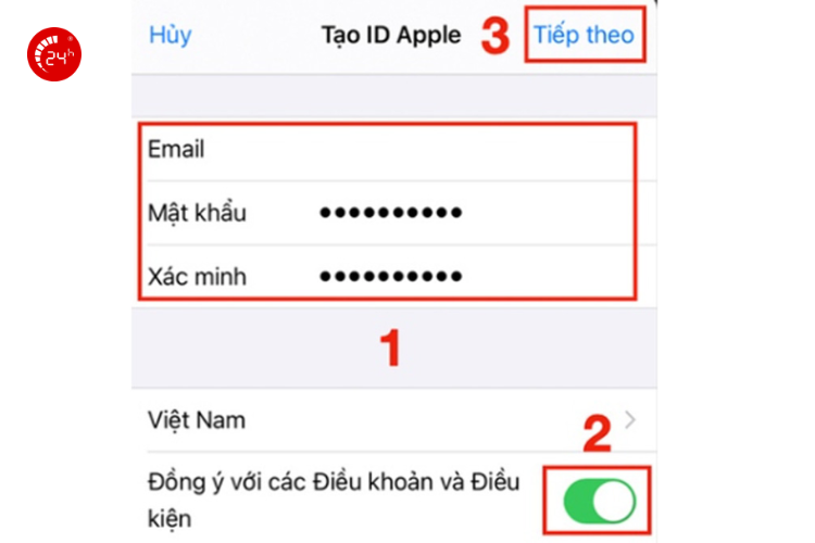 - Hoàn tất: Đồng ý với các điều khoản của Apple và xác minh email.