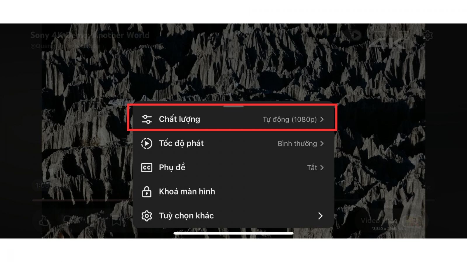 - Bước 2: Trong danh sách tùy chọn hiện ra, chọn mục Chất lượng (Quality) để thay đổi độ phân giải của video.