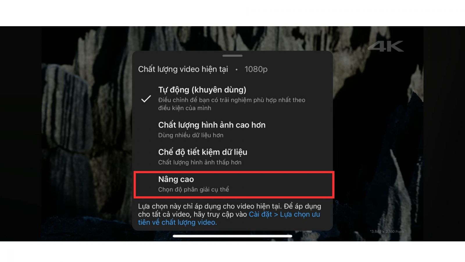 - Bước 4: Lúc này, YouTube sẽ hiển thị nhiều tùy chọn từ mức thấp đến cao. Bạn chỉ cần chọn 2160p (4K) để áp dụng cách xem YouTube độ phân giải 4K trên iPhone, từ đó video sẽ phát với độ nét cao nhất nếu thiết bị và kết nối mạng đáp ứng được.