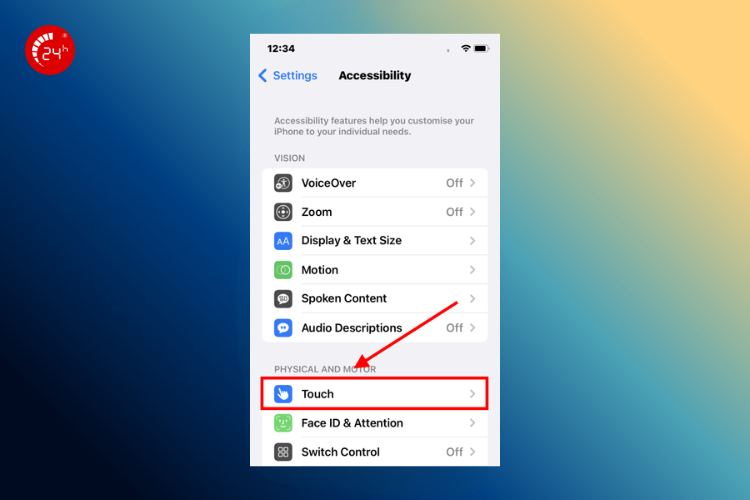 - Bước 2: Chọn Cảm ứng (Touch) > Chọn Thích nghi cảm ứng (Touch Accommodations).