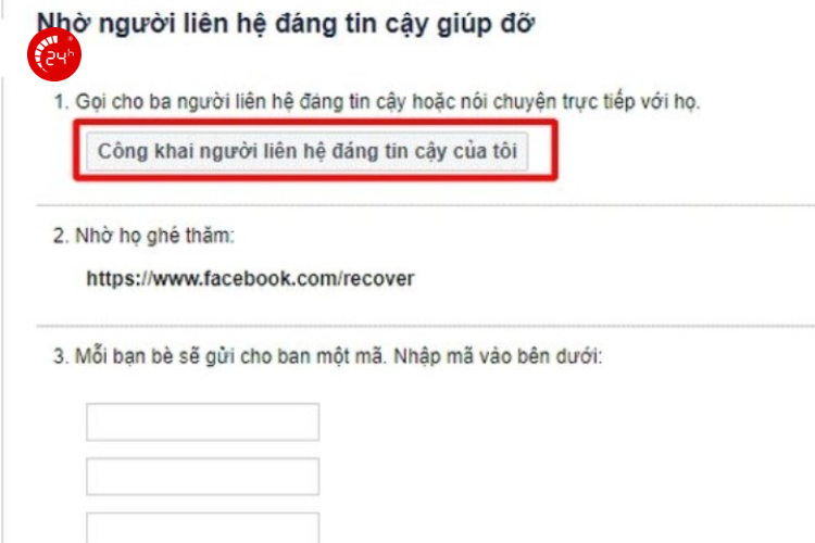 - Bước 5: Tại màn hình "Nhờ các người liên hệ đáng tin cậy giúp đỡ", hãy nhấn vào nút Công khai các liên hệ đáng tin cậy của tôi.