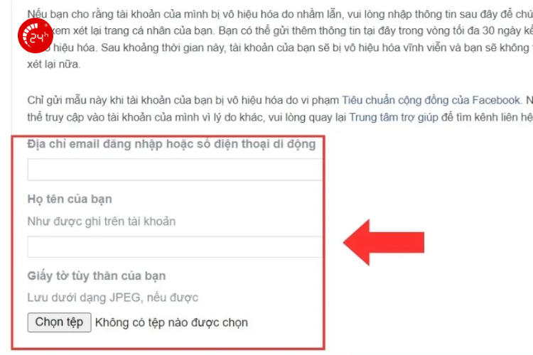 - Truy cập: https://www.facebook.com/help/contact/233841356784195.