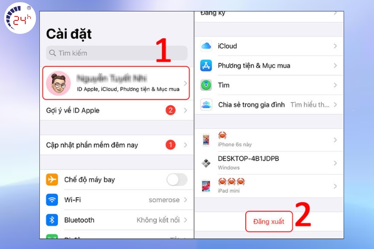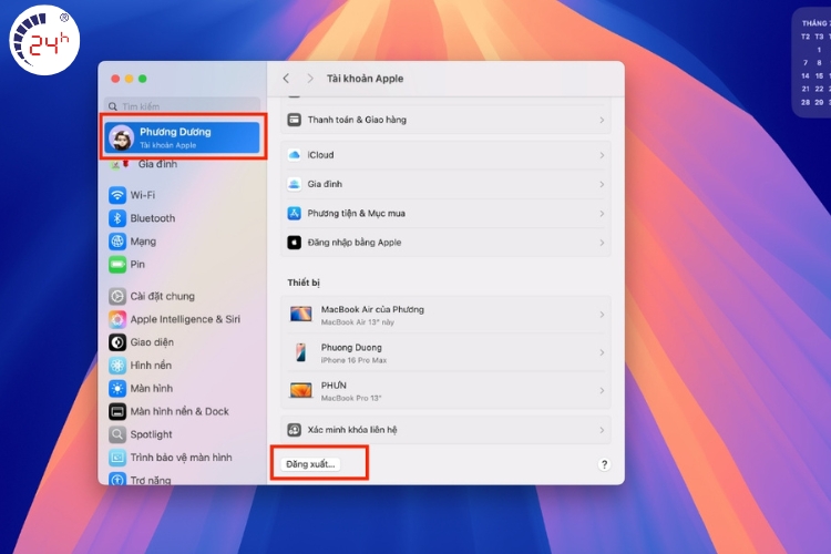 - macOS Ventura trở lên: Vào menu Apple > Cài đặt hệ thống (System Settings) > Bấm vào tên bạn > Chọn Đăng xuất.