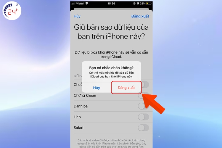 - Bước 3: Nhập mật khẩu của iCloud > Chọn giữ lại hoặc xóa các dữ liệu như danh bạ, ghi chú,... trên thiết bị > Đăng xuất.