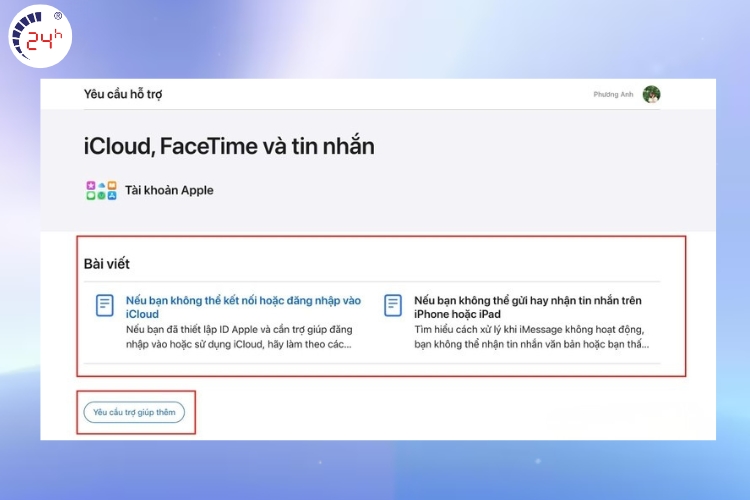 Bước 4: Chọn chủ đề liên quan đến "Khóa kích hoạt". Nếu các bài viết hướng dẫn không giải quyết được, hãy nhấn "Yêu cầu trợ giúp thêm" để đặt lịch hẹn nhân viên Apple gọi lại cho bạn.