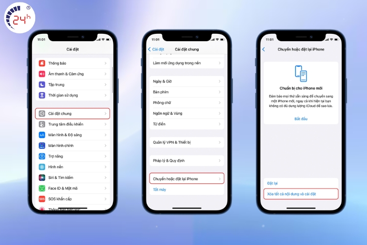- Vào Cài đặt > Cài đặt chung > Chuyển hoặc đặt lại iPhone > Xóa tất cả nội dung và cài đặt.
