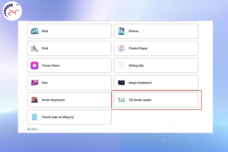 Bước 2: Tại giao diện chính, bạn chọn mục Xem sản phẩm của bạn, sau đó nhấn vào Tài khoản Apple.