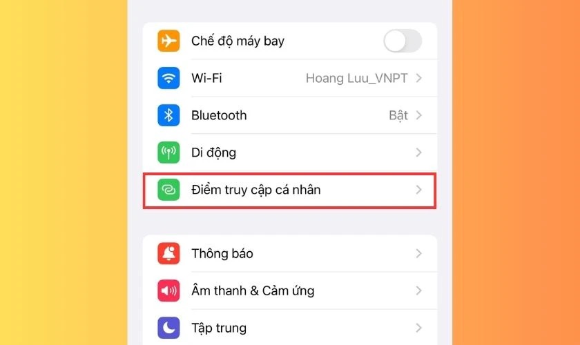- Bước 1: Vào Cài đặt trên iPhone → Chọn Điểm truy cập cá nhân.