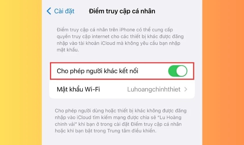 Điểm truy cập cá nhân trên iPhone là một công cụ hữu ích cho phép bạn dùng kết nối dữ liệu di động của máy để cấp mạng cho thiết bị khác như laptop, máy tính bảng hoặc điện thoại. Khi kích hoạt, iPhone sẽ biến thành một “trạm phát” Wi-Fi di động thu nhỏ, chia sẻ Internet từ gói cước đang sử dụng để các thiết bị xung quanh có thể kết nối và truy cập mạng dễ dàng.