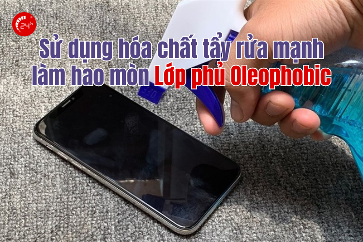 - Hóa chất tẩy rửa: Sử dụng cồn hoặc nước rửa kính có chứa chất tẩy mạnh sẽ hòa tan và phá hủy cấu trúc lớp phủ Oleophobic ngay lập tức.