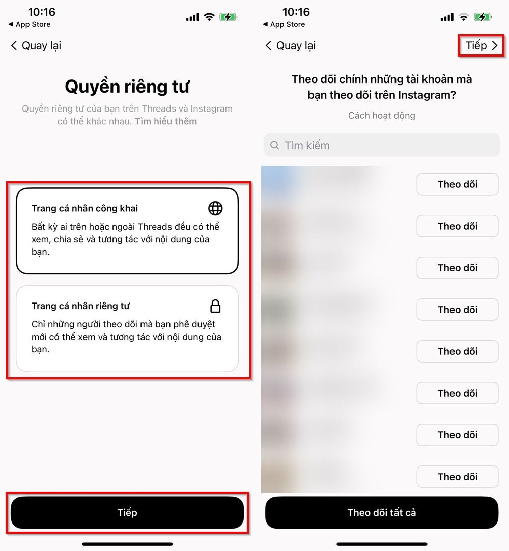 Bước 2: Chọn chế độ quyền riêng tư gồm công khai hoặc riêng tư. Sau đó nhấn Tiếp tục, chọn những tài khoản muốn theo dõi rồi bấm Tiếp.