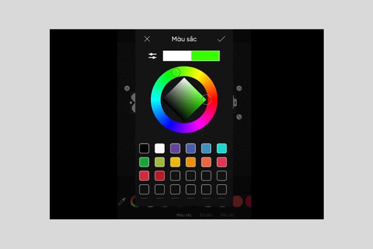 Bước 6: Kế đó, bạn hãy bấm chọn vào phần Màu sắc có trên thanh công cụ -> Nhấn chọn vào vòng tròn có nhiều màu sắc -> Chuyển nó qua màu xanh lá cây để đổi được nền chữ -> Cuối cùng, bấm nút dấu tích.