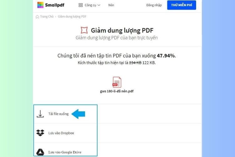 Bước 3: Sau khi file đã tải lên thành công, bạn bấm chuột vào Mũi tên chỉ xuống. Nếu bạn muốn tải vào Dropbox hay Google Drive thì hãy chọn icon bên cạnh tương ứng. Ở phía trên công cụ này sẽ thông báo cho bạn biết rằng file đã giảm dung lượng được bao nhiêu.