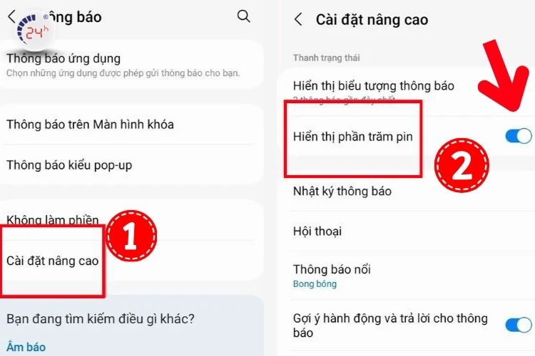 - Bước 2: Chọn Cài đặt nâng cao (Advanced settings) > Gạt nút sang màu xanh ở mục Hiển thị phần trăm pin (Show battery percentage).