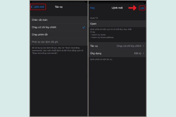 Lưu ý: Câu lệnh áp dụng chỉ hỗ trợ tiếng Anh, tốt nhất nên chọn từ “Open” để cho thuận tiện nhất khi dùng, hoặc bạn có thể thay thế bằng câu nói quen thuộc “Hey Siri”