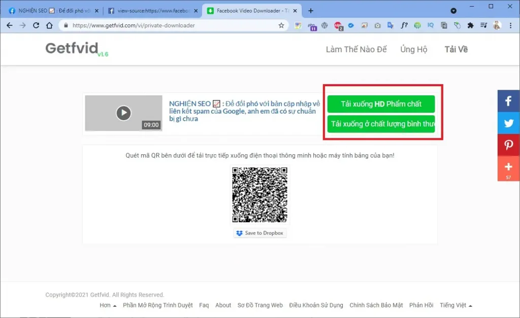 Bước 5: Dán mã nguồn vào công cụ Getfvid. Bạn dán mã nguồn đã sao chép lúc trước vào giao diện của Getfvid. Sau đó nhấn nút Tải về ở phía dưới để tiến hành phân tích trang và lấy video muốn tải xuống.