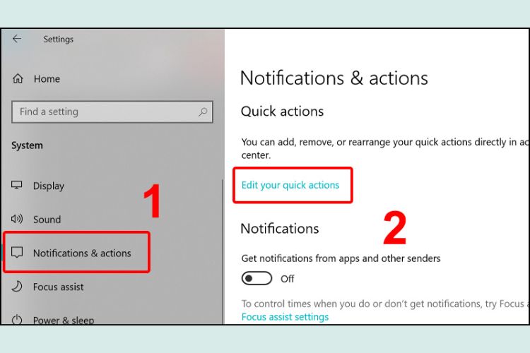 Bước 3: Trong tab Notifications & actions > Nhấn vào Edit your quick actions.