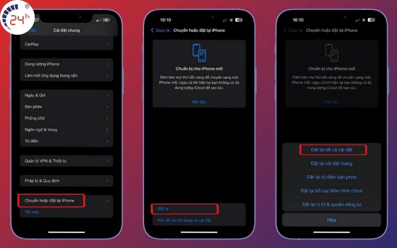 - Tìm và chọn mục Chuyển hoặc đặt lại iPhone > Đặt lại > Cuối cùng, chọn "Đặt lại tất cả cài đặt" (Reset All Settings).