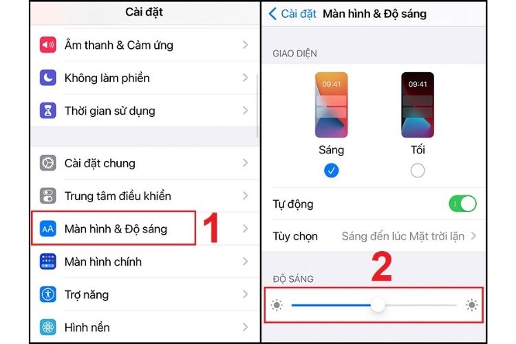 Cách 2: Tiến hành mở Cài đặt, chọn Màn hình & Độ sáng. Tiếp tục kéo thanh trượt để tùy chỉnh độ sáng phù hợp theo nhu cầu.