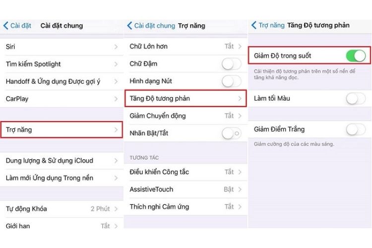 Bước 2: Vào mục Trợ năng > nhấn Tắt mục Giảm độ trong suốt.